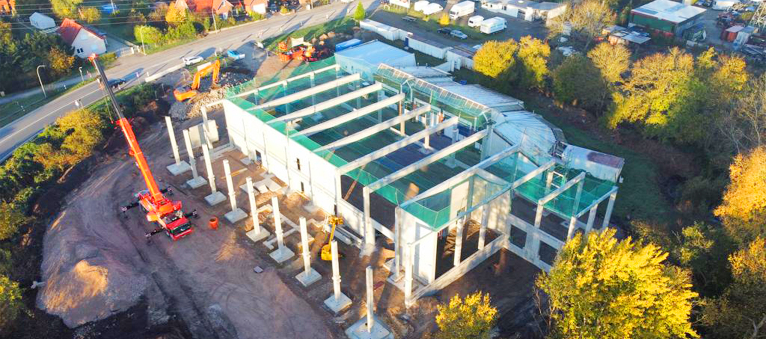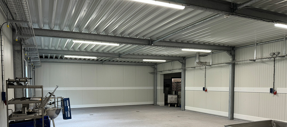 Schlachterei. Architektur, Planung, Rohbauarbeiten, Gründung, Bodenplatte, Stahlbauarbeiten, Dachtragwerk, Dachabdichtung, Fenster/Türen u. Tore, Rammschutzarbeiten
